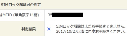 なるほど。 試しに僕のスマホのIMEI番号で判定してみよ。 どれ・・・ ![]() なぬ? SIMロック解除はまだお手続きできません!? 2017/10/27以降に再度お手続きください!? |