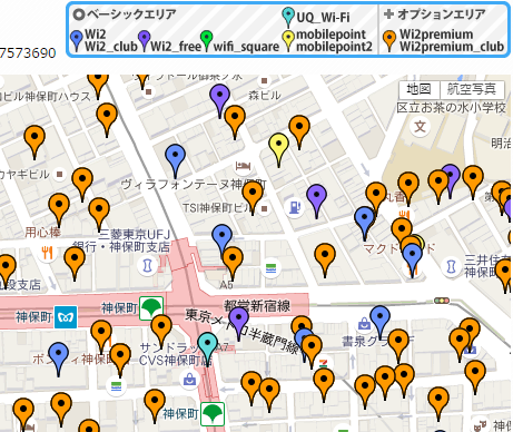 といっても、これだけ見てもピンと来ません。公式サイトに利用可能エリア検索ページがあるので試しに検索してみます。職場から近い東京・神保町を検索してみました! 結果は下の地図のとおり。 ![]() BIC SIMの特典では利用できないオレンジ色の オプションエリアが多いです・・・。 特典で利用できる箇所を見ていくと 黄色のBBモバイルポイント ⇒ 2ヶ所(1ヶ所は隠れ気味) 水色のUQ Wi-Fi ⇒ 都営地下鉄の駅の1ヶ所のみ あとは青色のWi2_clubと紫色のWi2_freeがパラパラといったところ。 けどまあ無料ということを考えると、これだけ利用できるだけでもよいのではと思います。 ※なお、BBとUQで本来は利用できる東海道新幹線は、公式サイトのとおり、このBIC SIM特典の月額定額プランでは利用不可とのことです。 |