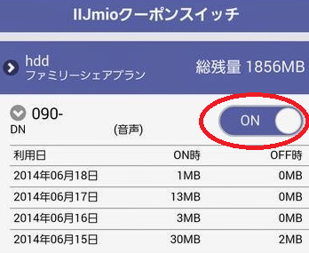 続いては 「高速/低速 切替機能」 について。 これはそのままだけど、高速データ通信と低速データ通信のどちらを使いたいかを自由に切り替えることができる機能だ。 BIC SIM(IIJmio)の高速低速切替アプリみおぽんの画面。赤マルで囲った部分を操作することで、OM(高速)とOFF(低速)を簡単に切り替えることが可能。 ![]() |