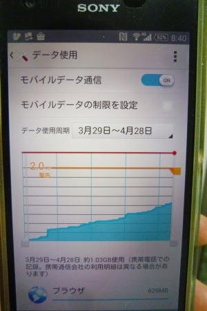 いや、現在スマホを利用中の方は端末(スマホ本体)で確認することができる。操作手順は端末によって多少異なるけど、例えば私のXperiaの場合は メニュー画面に転がっている「設定」 と進むと確認できた。試しに「3月29日~4月28日」の1ヶ月間のデータ使用量を見てみると・・・ ![]() これを拡大すると・・・ ![]() |